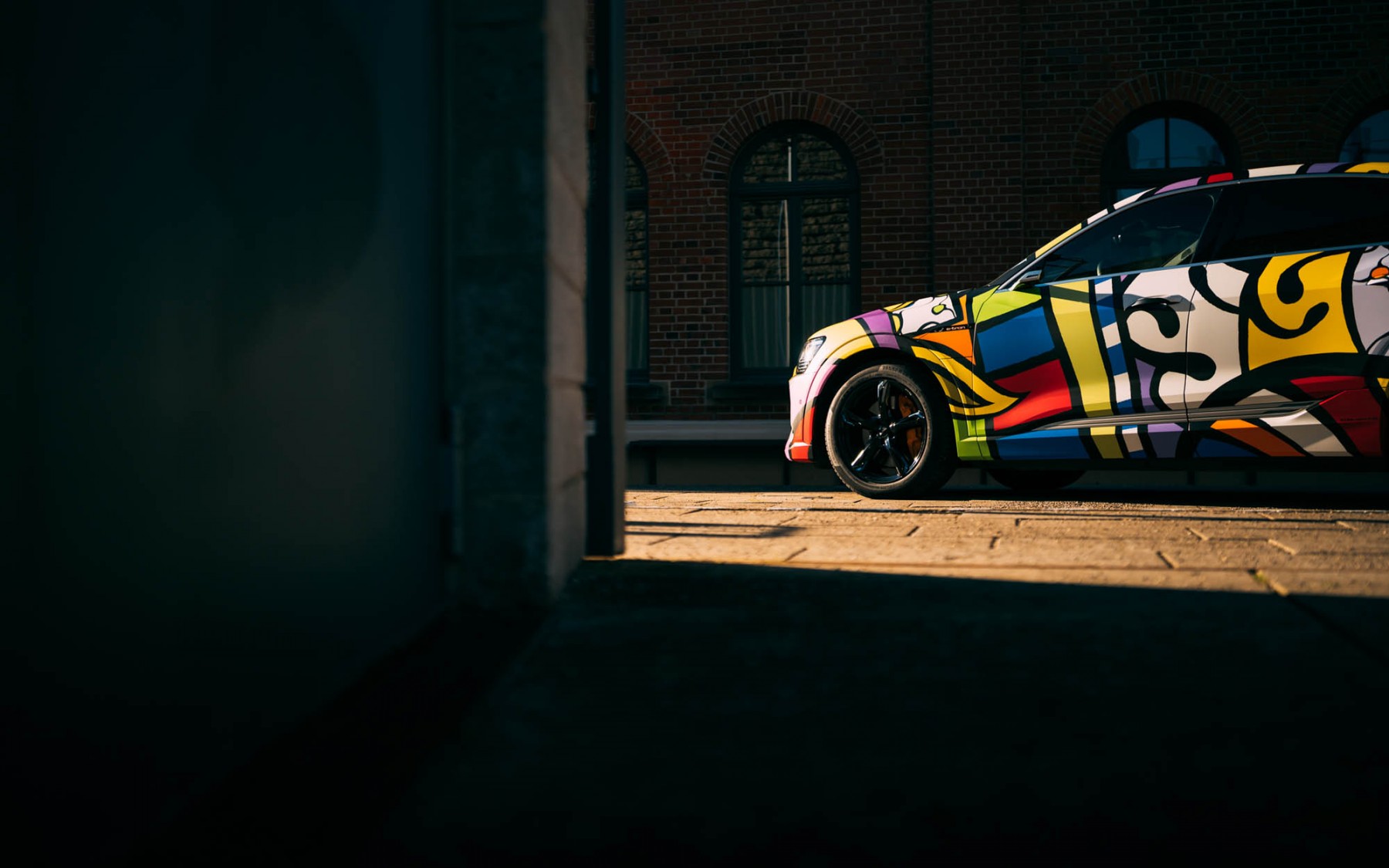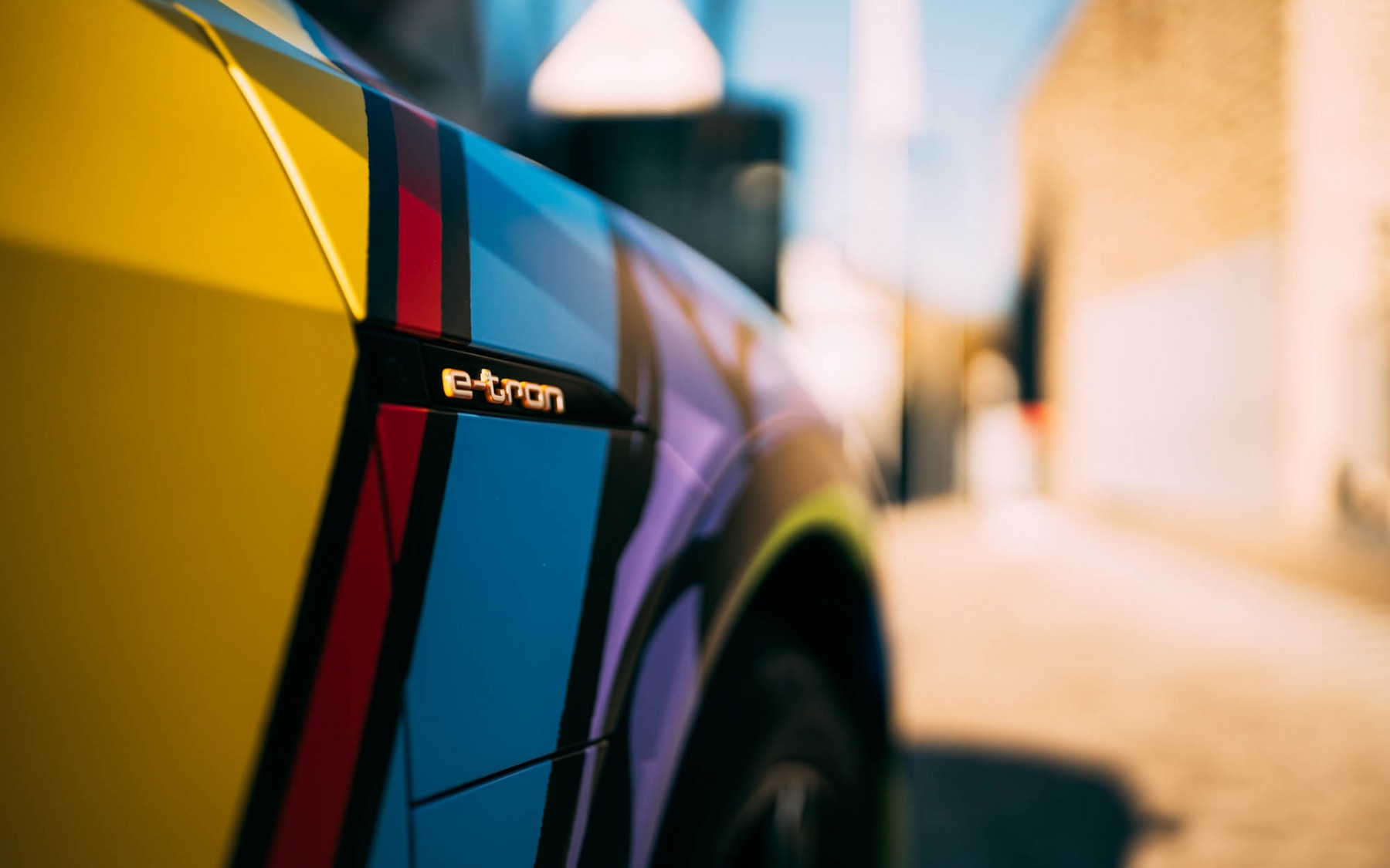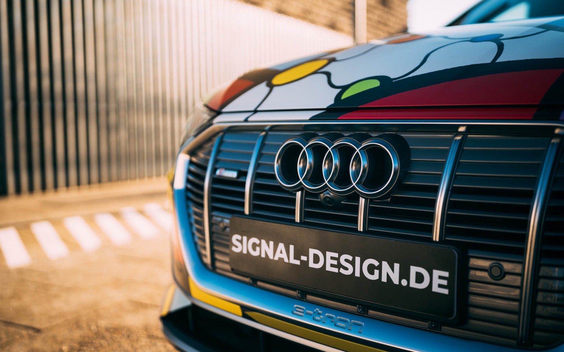Autos mit viel PS spielten in ihrer Familie schon immer eine große Rolle, doch meist eher für den Ehemann und die Söhne. Jetzt hat sich die Baden-Württembergerin selbst einen Traum erfüllt. Denn ihr grauer Audi e-tron Sportback edition one sollte nicht länger das fordernde Jahr 2020 repräsentieren, sondern einen lebensfrohen Neustart in 2021 markieren. Raus aus dem langweiligen Anzug, her mit einem bunten Kleid. Sie inspirierte mit ihren Ideen den in der Nähe von Hamburg lebenden Künstler Timo Wuerz, der schon seit Jahren sehr erfolgreich mit SIGNal Design Autos zu Kunstwerken werden lässt. Denn Gründer und Inhaber von Signal Design ist begeistert von solchen Aufgaben. „Hier laufen wir zur Höchstform auf, denn die Folie wird absolut exakt auf das ganze Auto angepasst. Uns ist es dabei vor allem wichtig, dass die Übergänge passen, gerade beim Zusammespiel von Kotflügel, Frontstoß und Motorhaube. Denn jedes einzelne Karosserieteil ist aus einem Stück Folie geklebt und das Design muss an den Übergängen exakt fortgeführt werden. Das ist unser Anspruch und das ist uns hier wieder gelungen. Unser kompletter Prozess ist einzigartig.“