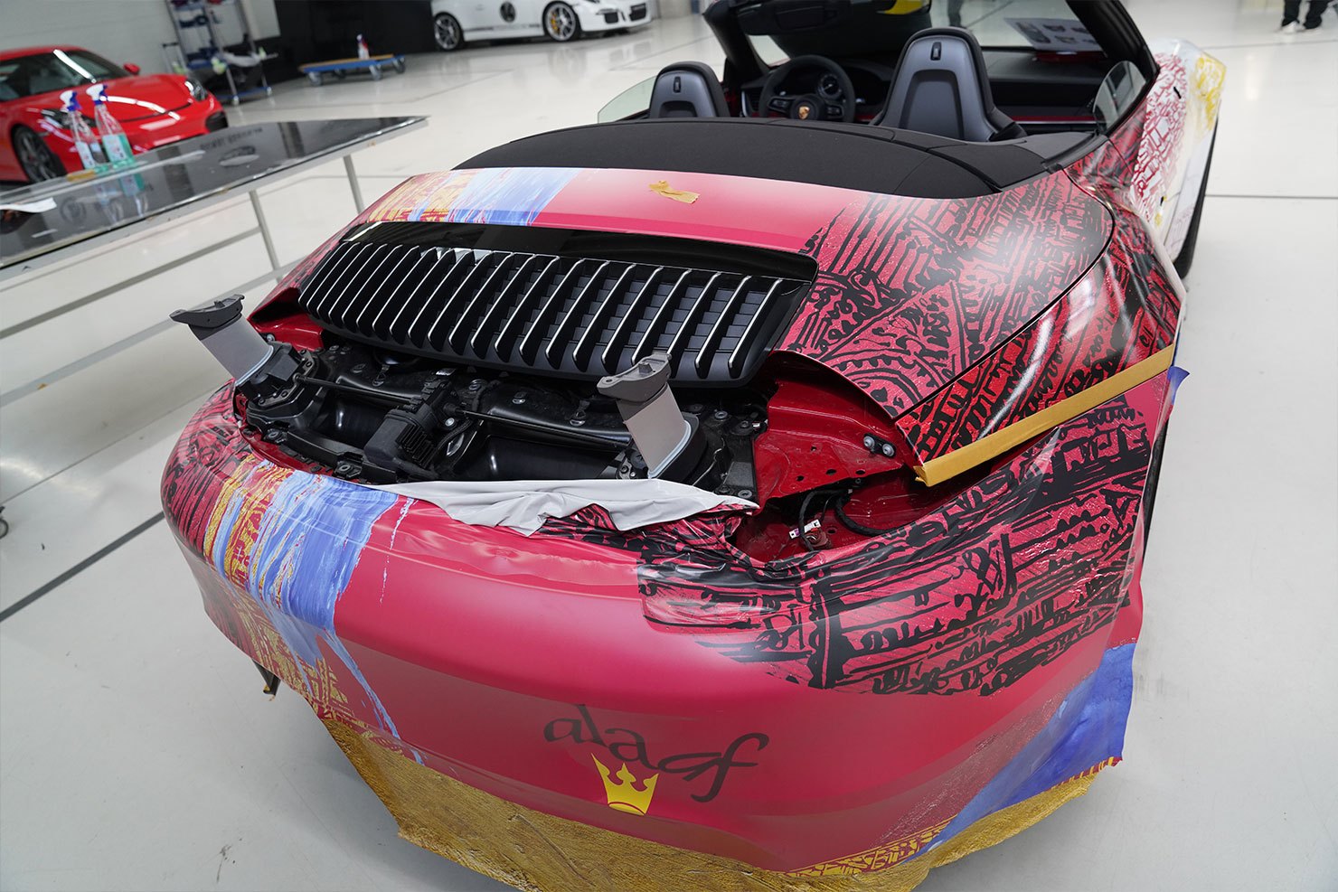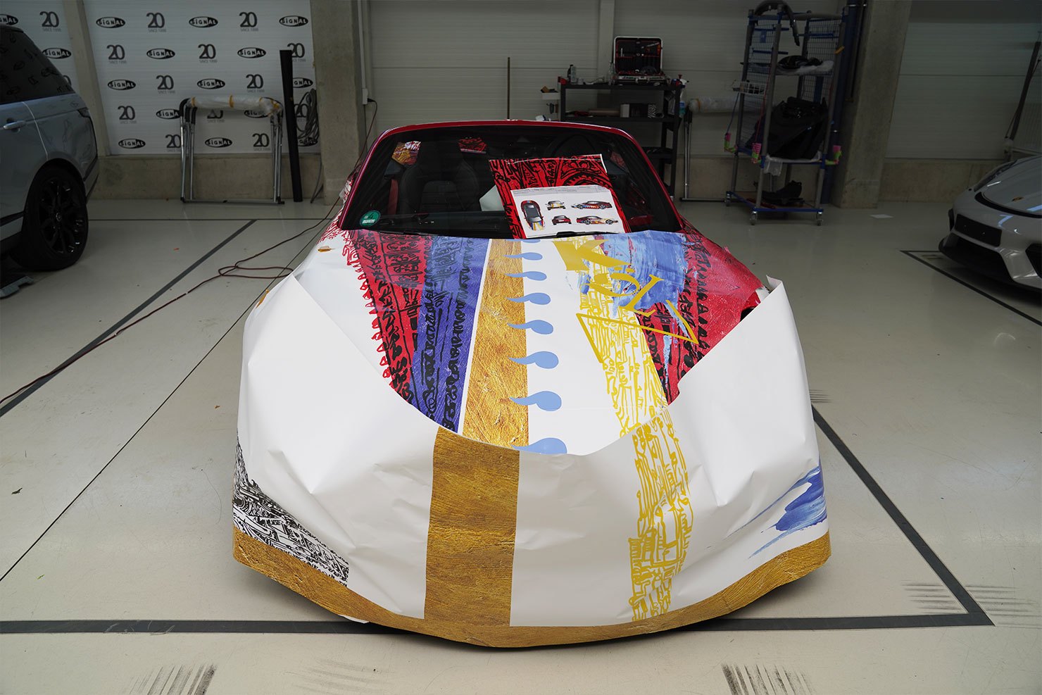 Der Wrapping Prozess lief bei diesem Modell anders ab als bei einer einfarbigen Vollfolierung. Da die Übergänge im Design perfekt sein und sich das Design ohne Unterbrechung oder Versatz über das Fahrzeug ziehen sollten, haben wir mit einer Promo Folie gearbeitet. Die Folie wurde mit dem Design bedruckt und auf den Porsche angebracht, aber erstmal nur probeweise. So konnten die Monteure und das Grafikbüro genau sehen, wo eventuelle Anpassungen am Design nötig wären. Durch Wölbungen am Fahrzeug, die auf einer 2D Grafik nicht dargestellt werden, können sonst nämlich kleine Folienüberlappungen an den verschiedenen Kanten entstehen. Das sollte bei diesem Design unbedingt vermieden werden.