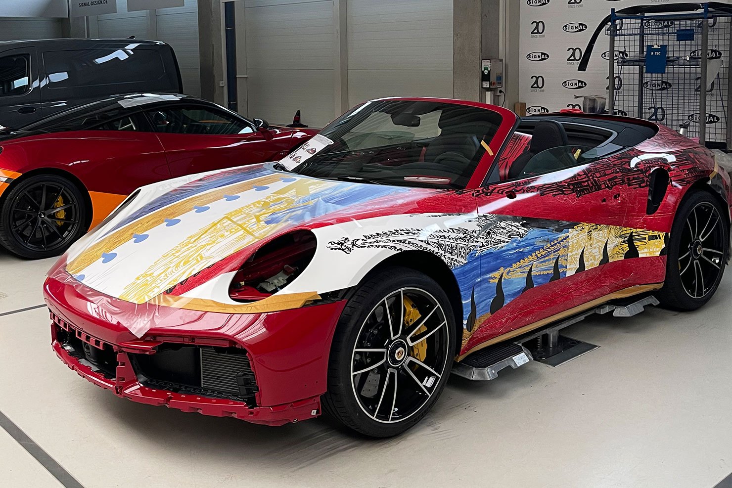 Stadt Design? Timo Wuerz wurde bei seiner Porsche Design Folierung für diesen Porsche 992 Turbo von der Stadt Köln inspiriert. So findet sowohl der Kölner Dom als auch die Schriftzüge „alaaf“ und „Köln“ Platz auf dem Sportwagen.