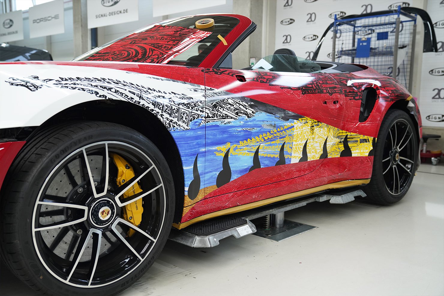 Timo Wuerz zeichnete dafür den Kölner Dom in filigranen Einzelteilen mit Tusche und scannte diese Zeichnung ein. So konnte das Grafikbüro die Zeichnung mehrmals ins Design der Porsche einarbeiten. In jeder Ecke des Porsche ist der Dom zu sehen. Außerdem haben es noch weitere Wahrzeichen der Stadt ins Design geschafft. Schauen Sie mal genauer hin – Sie finden sicherlich noch mehr! Der Porsche ist somit durch und durch ein echter Kölner Jung! Alaaf! Einzigartig und individuell wie sein Besitzer.