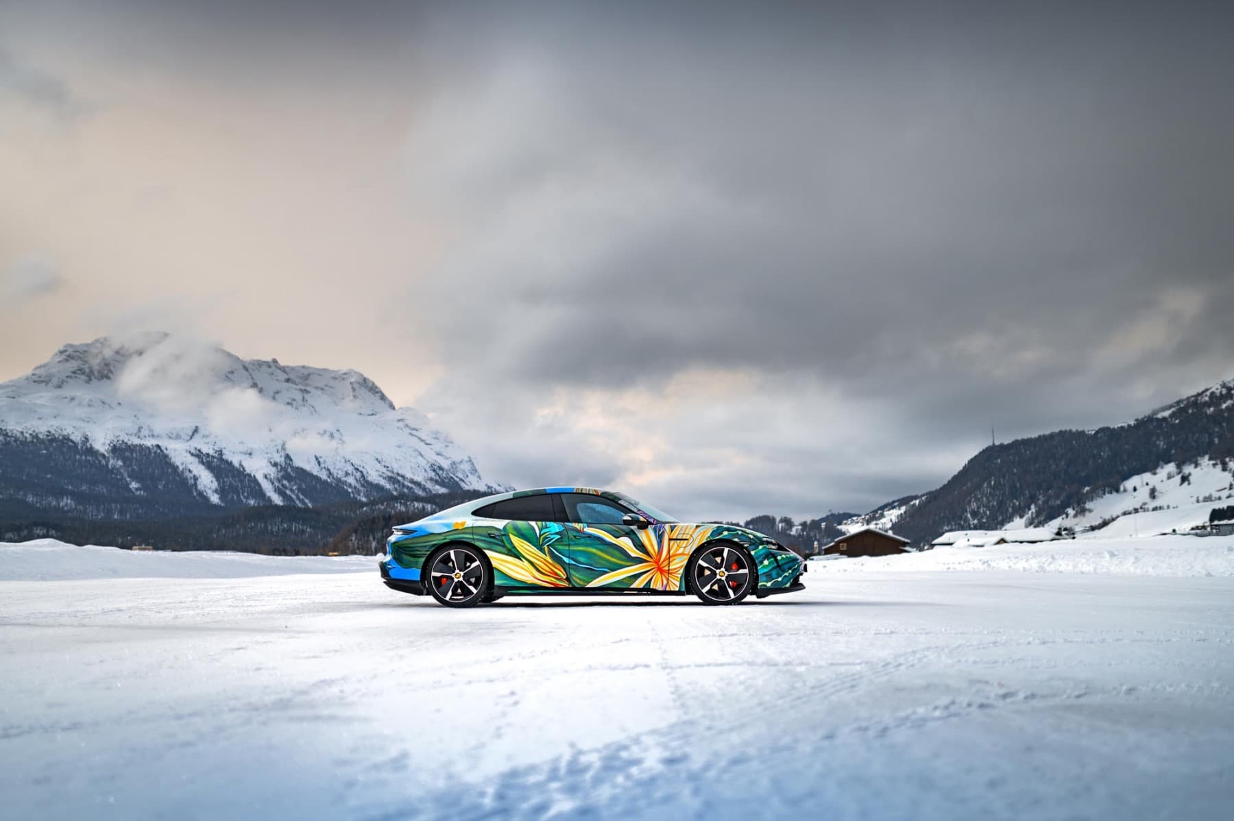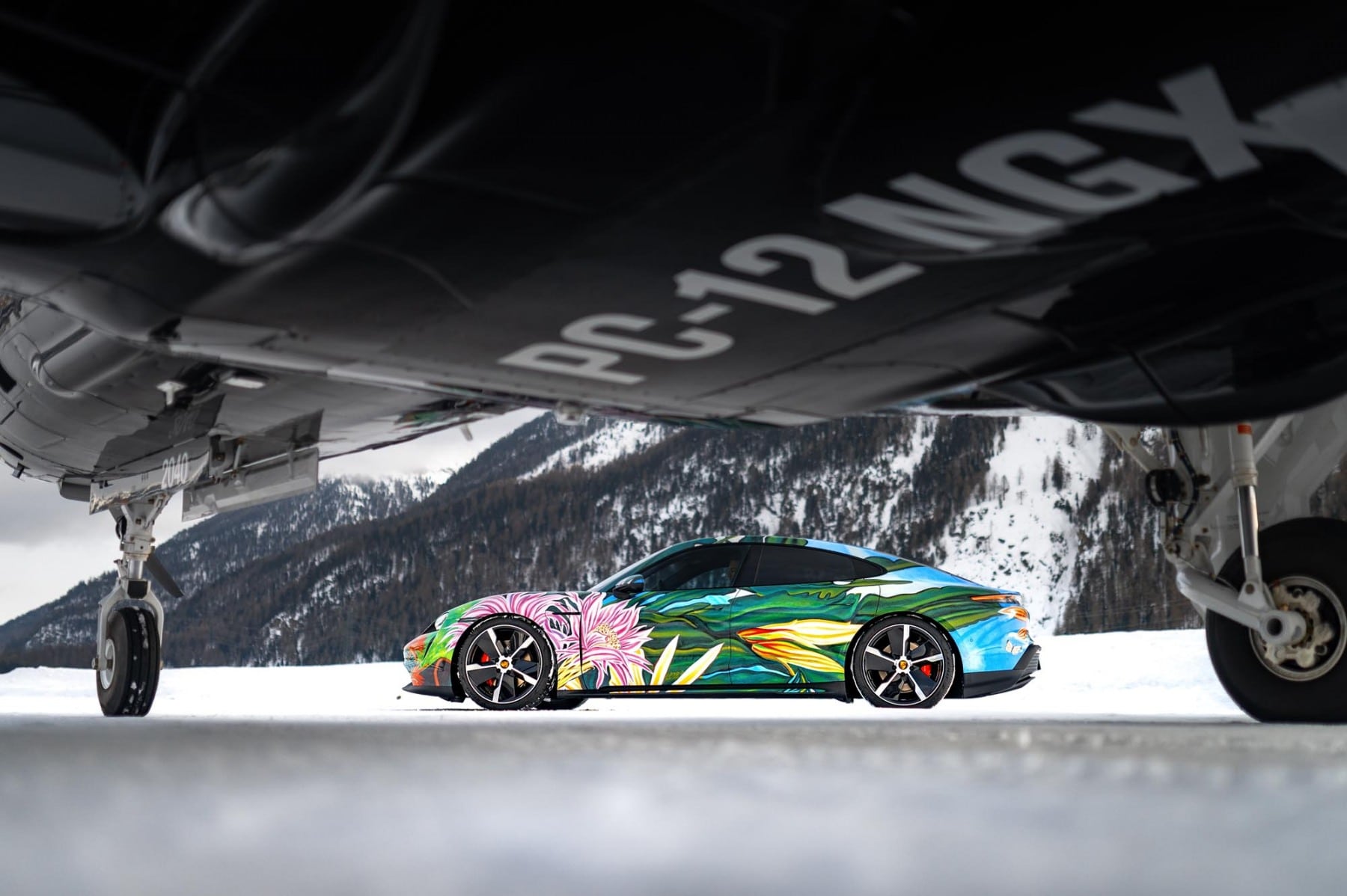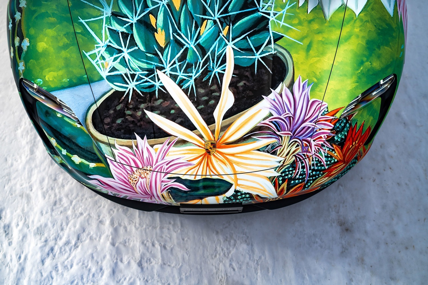 Richard Phillips übertrug sein großformatiges Gemälde „Queen of the Night“, das 2010 in Anlehnung an das Werk des legendären Schweizer Landschaftsmalers Adolf Dietrich entstand, auf die Karosserie eines Porsche Taycan 4S. Die Arbeit zeigt ein dreidimensionales Arrangement von Elementen und Details des circa 8 Quadratmeter großen Gemäldes, das sich organisch von der Motorhaube ausgehend über die vorderen Kotflügel und über die Türen erstreckt und mit den Blättern des Nachtblühers ein Gefühl der Geschwindigkeit vermittelt. „Die ganze Farbenpracht von ‚Queen of the Night‛ entfaltet sich am Heck des Wagens, wo die Blüte der ‚Königin der Nacht‛ den Stoßfänger vollständig umhüllt und durch die charakteristische horizontale Lichtleiste des Taycan eindrucksvoll beleuchtet wird“, erzählt Richard Phillips. „Ausgangspunkt für das gestalterische Konzept meiner ‚Queen of the Night‛ war der Taycan als sofort erkennbares Symbol für Elektromobilität und Geschwindigkeit.