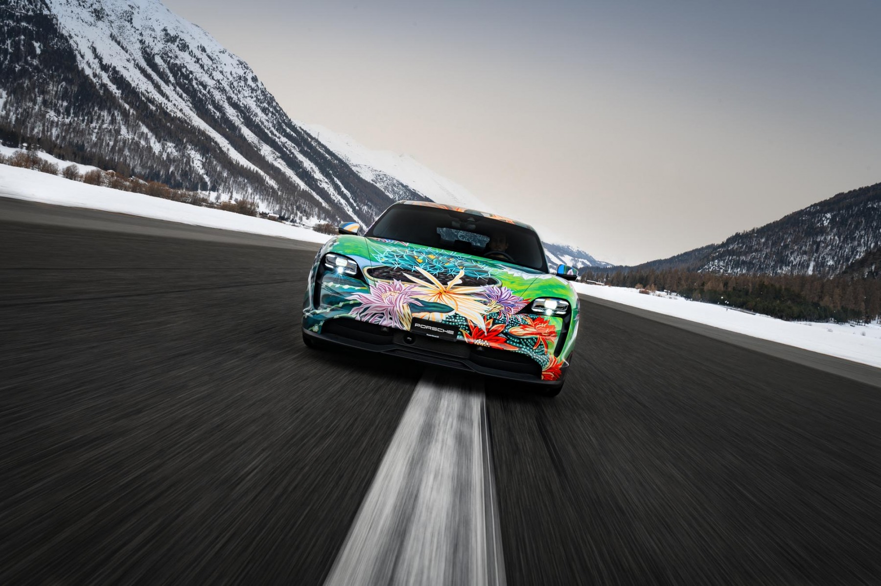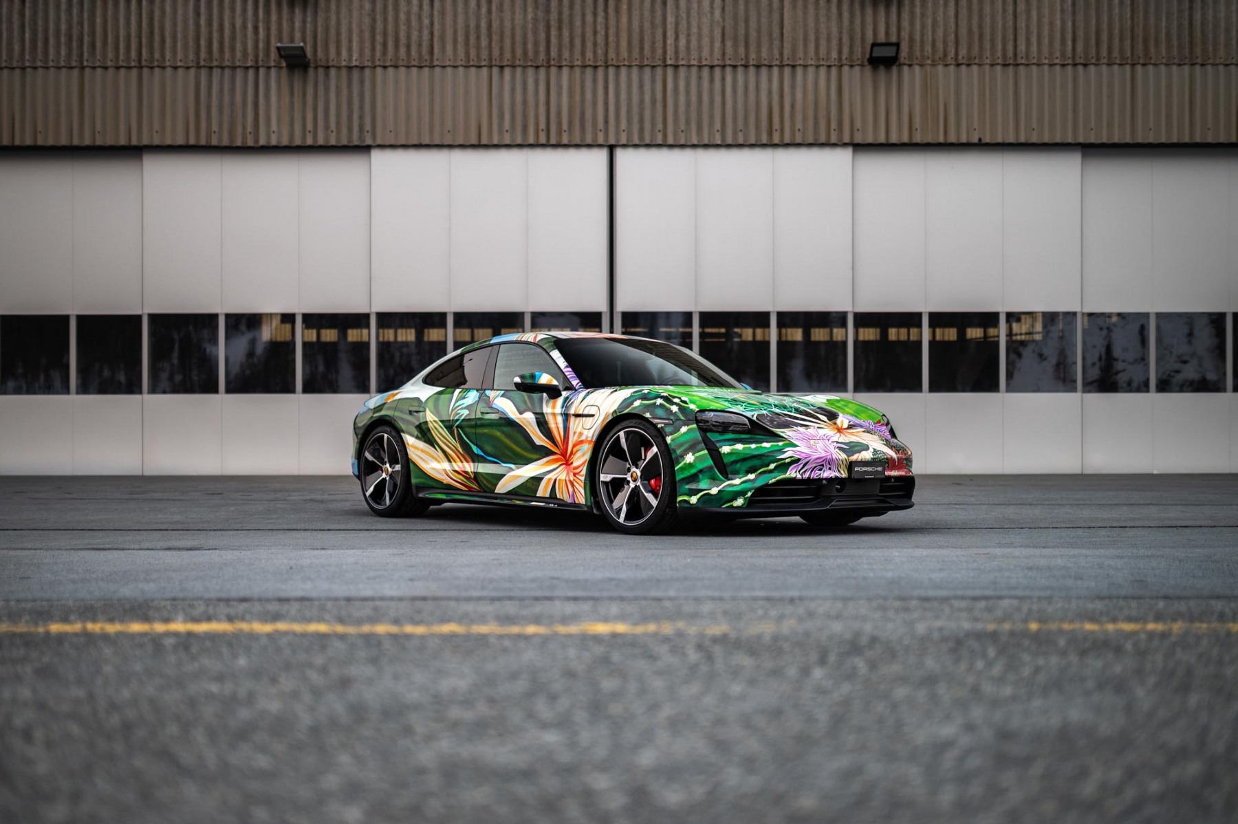 Richard Phillips übertrug sein großformatiges Gemälde „Queen of the Night“, das 2010 in Anlehnung an das Werk des legendären Schweizer Landschaftsmalers Adolf Dietrich entstand, auf die Karosserie des Porsche Taycan 4S. Die Arbeit zeigt ein dreidimensionales Arrangement von Elementen und Details des circa 8 Quadratmeter großen Gemäldes, das sich organisch von der Motorhaube ausgehend über die vorderen Kotflügel und über die Türen erstreckt und mit den Blättern des Nachtblühers ein Gefühl der Geschwindigkeit vermittelt. „Die ganze Farbenpracht von ‚Queen of the Night‛ entfaltet sich am Heck des Wagens, wo die Blüte der ‚Königin der Nacht‛ den Stossfänger vollständig umhüllt und durch die charakteristische horizontale Lichtleiste des Taycan eindrucksvoll beleuchtet wird“, erzählt Phillips. „Ausgangspunkt für das gestalterische Konzept meiner ‚Queen of the Night‛ war der Taycan als sofort erkennbares Symbol für Elektromobilität und Geschwindigkeit. Die enge Beziehung Dietrichs zur Landschaft war mehr als nur eine Darstellung seiner Umgebung. Sie sollte der Seele der Schweiz und des Bodensees Ausdruck verleihen. Dafür wird seine Kunst weltweit anerkannt und sie ist etwas, das mich tief bewegt hat.“